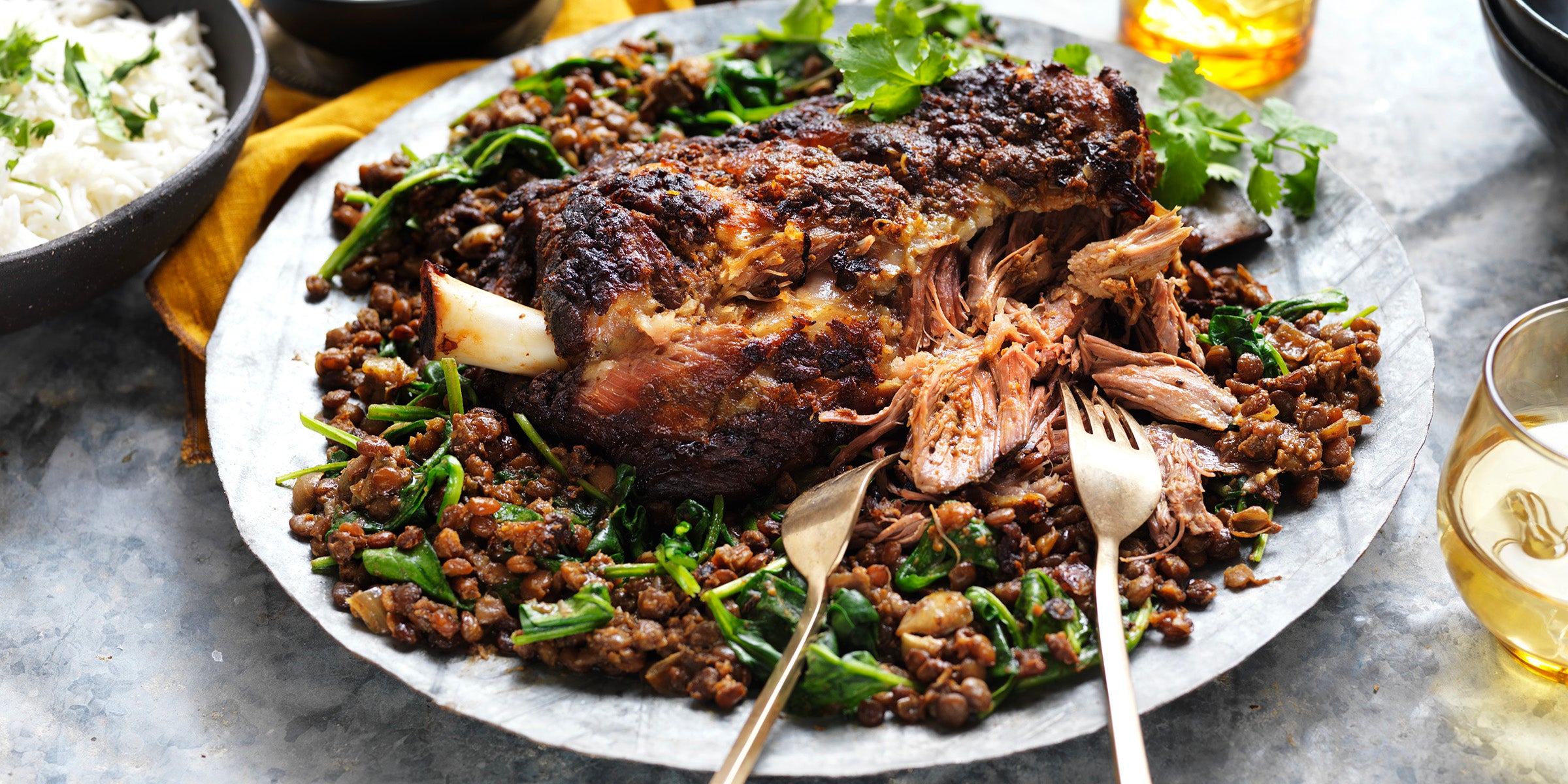 3. Transfer lamb to a serving platter and cover loosely to rest. Stir spinach into lentils until just wilted. Spoon lentil mixture around lamb. Sprinkle with cilantro sprigs and serve with rice and yogurt.